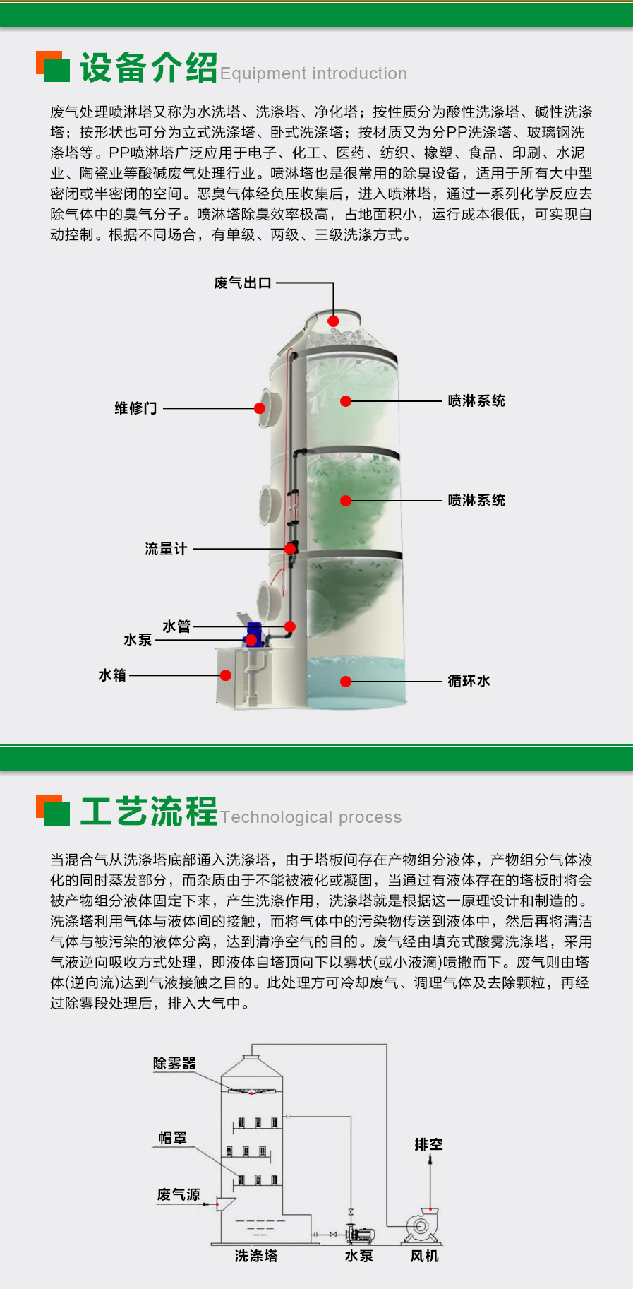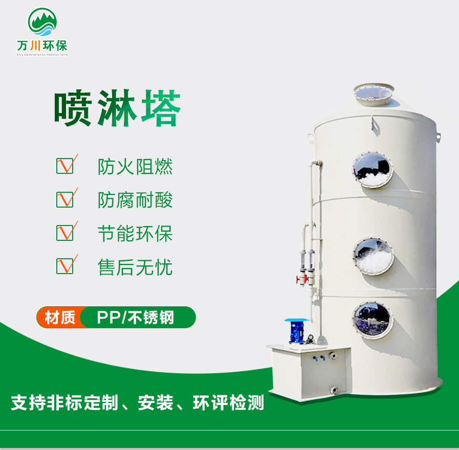 噴淋塔(俗稱(chēng):水淋塔)是一種處理煙塵廢氣的濕式環(huán)保設(shè)備,可適用于發(fā)電廠燃燒煙塵、鋼鐵廠、鍋爐燃燒、垃圾燃燒等煙塵廢氣處理,這類(lèi)的煙氣粉塵容易溶于水,噴淋塔是處理這類(lèi)煙氣粉塵的不二之選。煙氣粉塵從塔底進(jìn)入塔內(nèi),塔內(nèi)有填料支撐板,噴淋塔從塔頂噴出液體,液體均勻的分布在塔內(nèi)和污染物充分接觸,達(dá)到凈化的效果,最后塔頂排出。