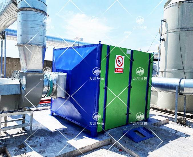 橡膠廢氣從管道進入到設備內,穿過第一層噴淋層,用水沖洗廢氣,再進入到第二、第三層填料層,去除水溶性的粉塵和廢氣,最后進入到活性炭吸附層,利用活性炭的吸附力,吸附有機廢氣,達到凈化的效果。